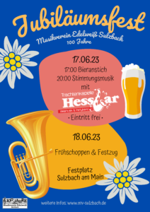 100 Jahre MV Sulzbach, dieses stolze Jubiläum konnten wir im Jahr 2023 feiern. Wer mehr über die Vereinsgeschichte und das aktuelle Vereinsleben erfahren will findet allerlei Informationen auf diesen Seiten.