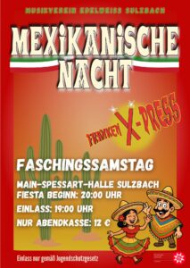 Am Faschingssamstag laden wir euch herzlich zur Mexikanischen Nacht in die Main-Spessart-Halle Sulzbach ein!